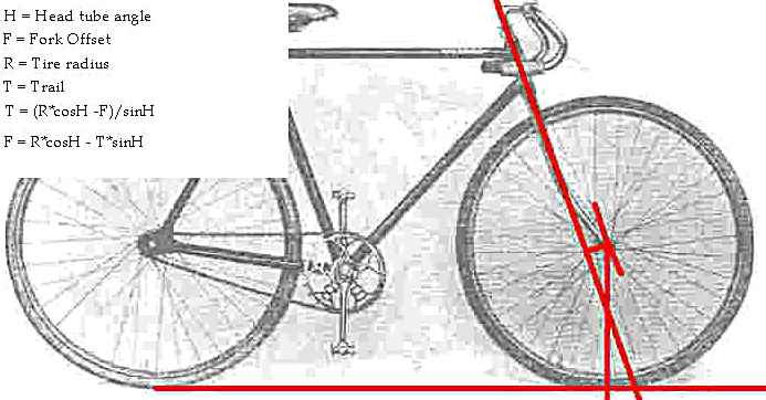As shown in the formulas on the left, trail can be calculated given the head tube angle, the radius of the inflated tire, and the amount of fork offset. For someone designing a fork, it is more useful to start with the desired trail and calculate the needed fork offset, which can be determined from the tire radius, head tube angle, and trail.