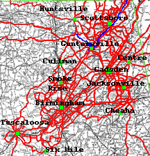 A NOTE ABOUT THE MAPS: I could not reproduce road maps without violating the copyright laws. While the original was a road map, the details have been deliberately blurred beyond recognition. The lines in red are all the roads I have traveled in Alabama by bicycle up until January 2001. The route of each trip is marked in black. Cities and important places to my accounts are marked on this first map (the green squares marking the exact location), but won't be indicated on the others. On the other maps, places where I stayed inside a house are marked with a green square and places where I camped are marked with a green triangle.