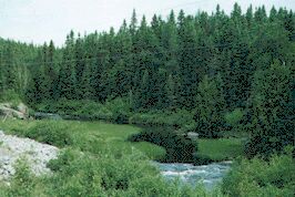 The weather still doesn't look good, but I've lost my desire to linger, and I head out of town. For a ways, the roadway has a good shoulder. The rest of the day is spent traveling down the highway with no paved shoulders and mainly spruce woods on either side -- birches are also common -- and stopping briefly at small towns. There's no wind to fight and no steep hills, so I make good time. At four thirty, I stop at the provincial park at Cadillac and dry my tent in the slight sun, use the rest room, and fill my bottles.