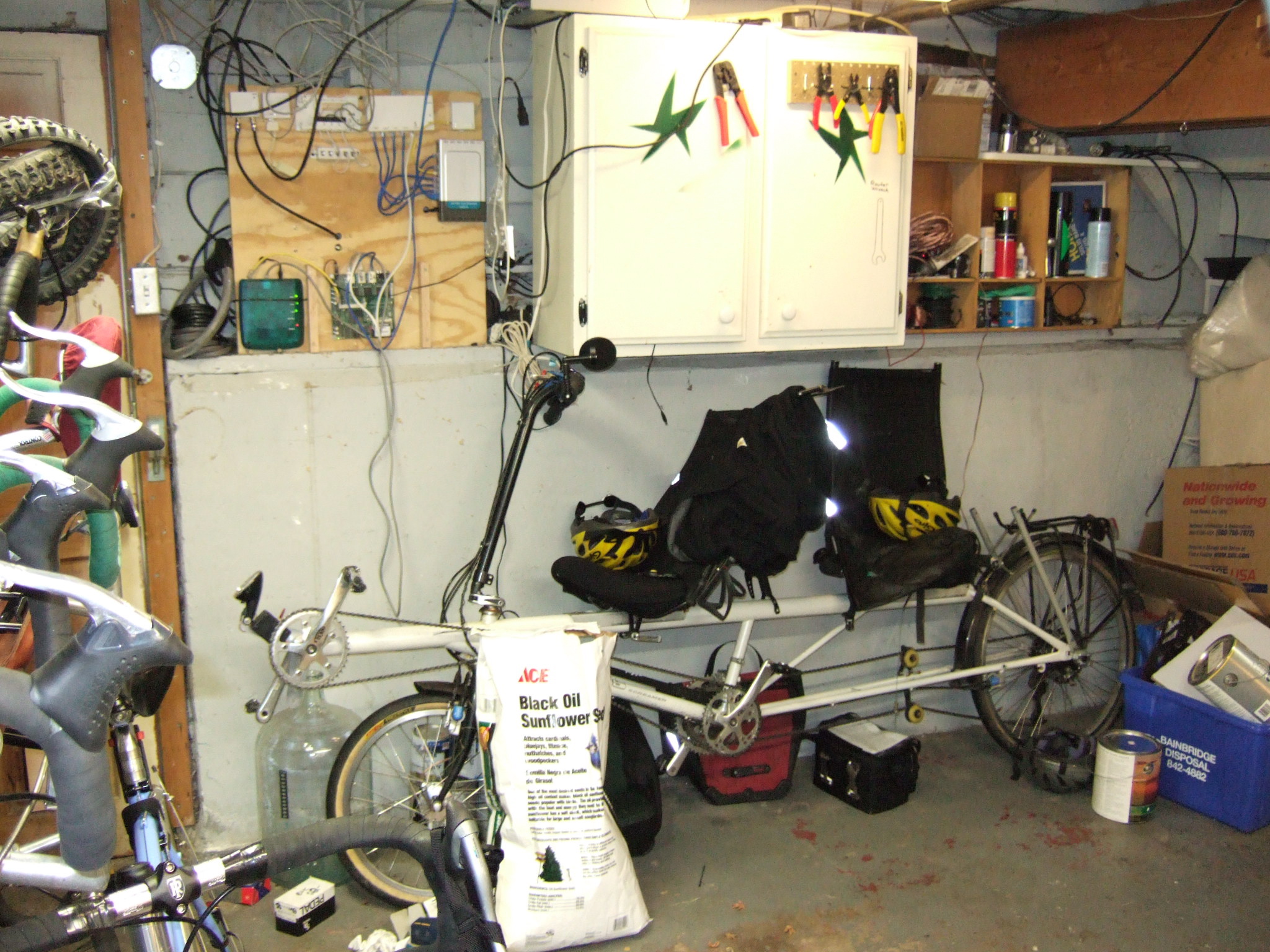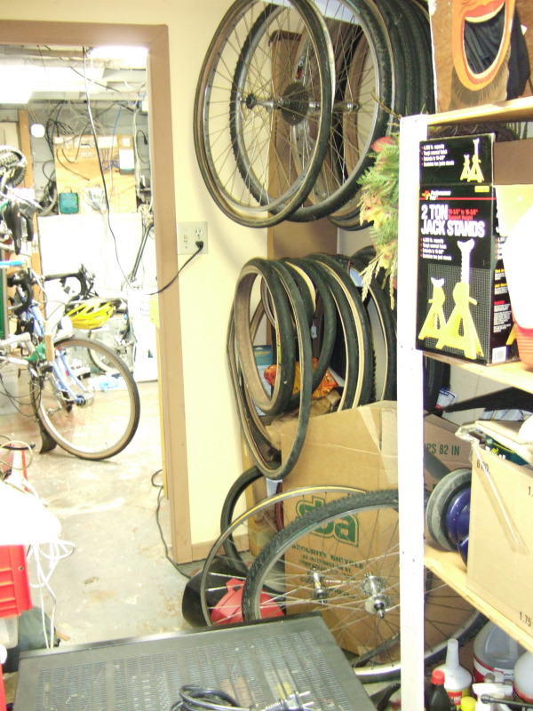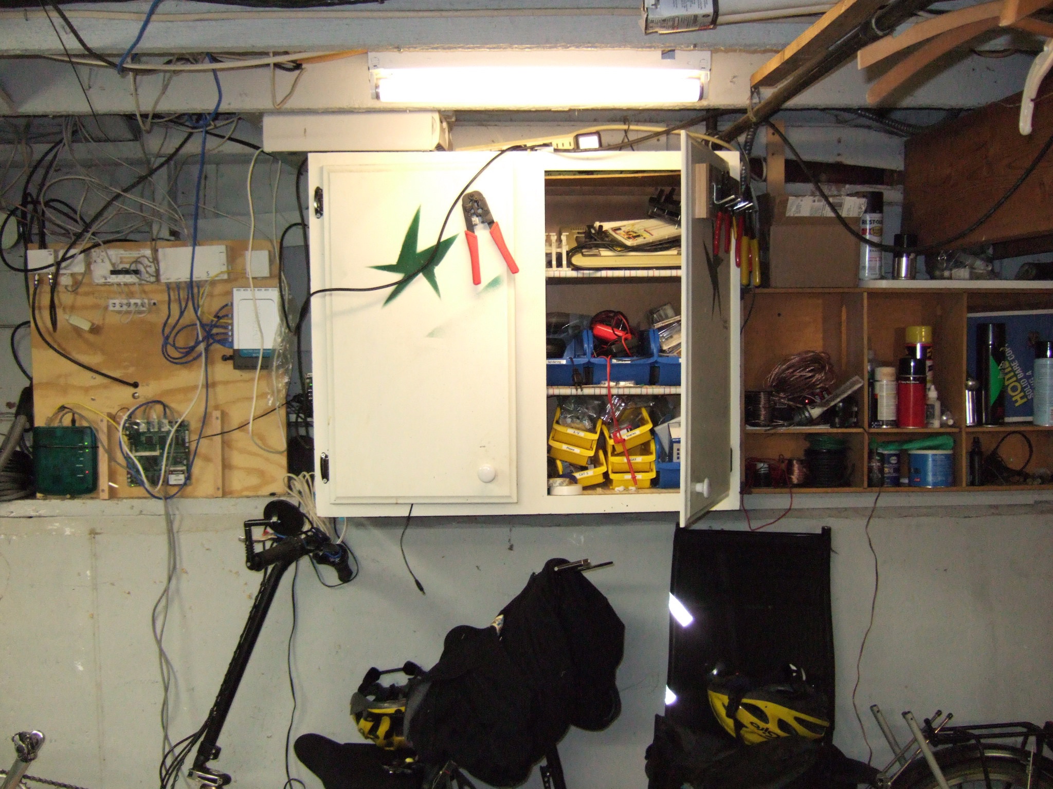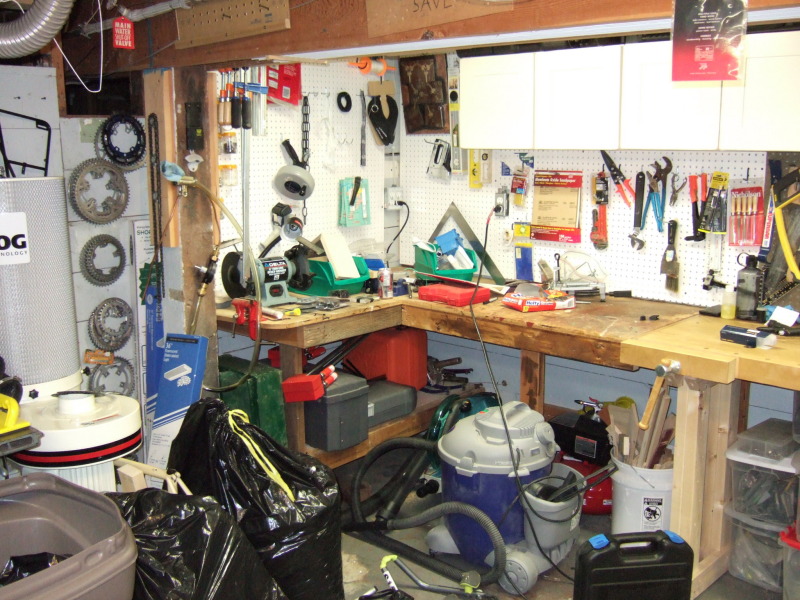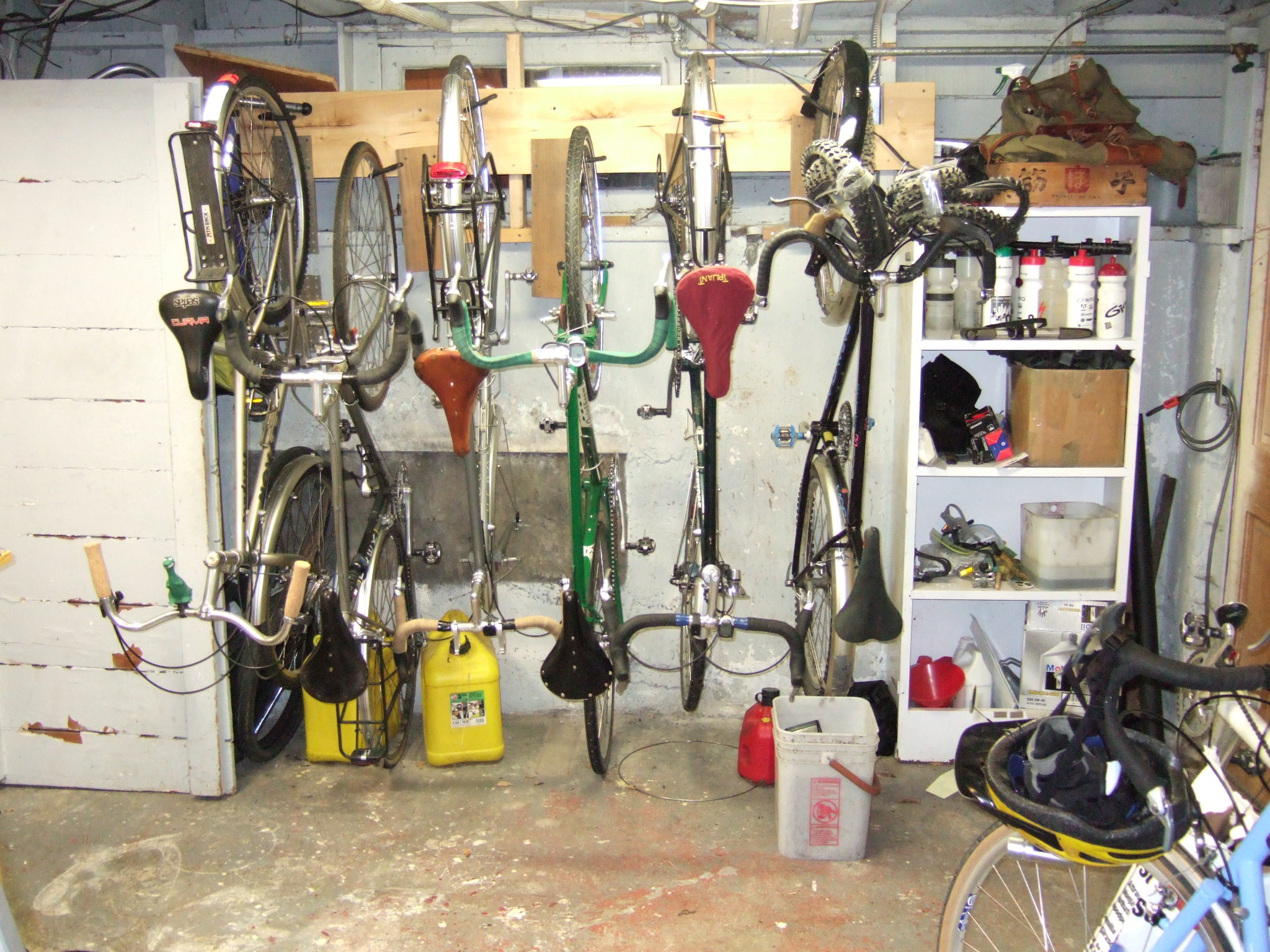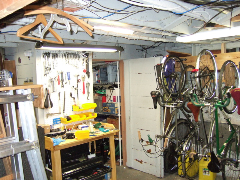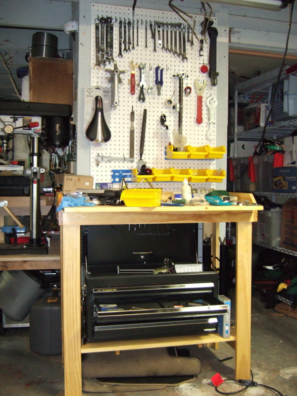 wall at one end. The cabinets and pegboard mostly don't have bike