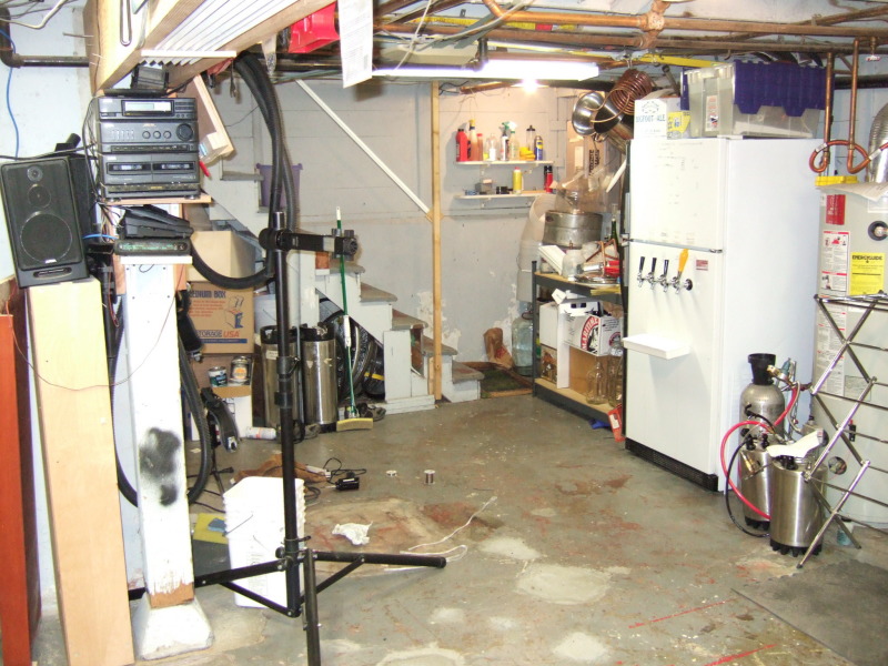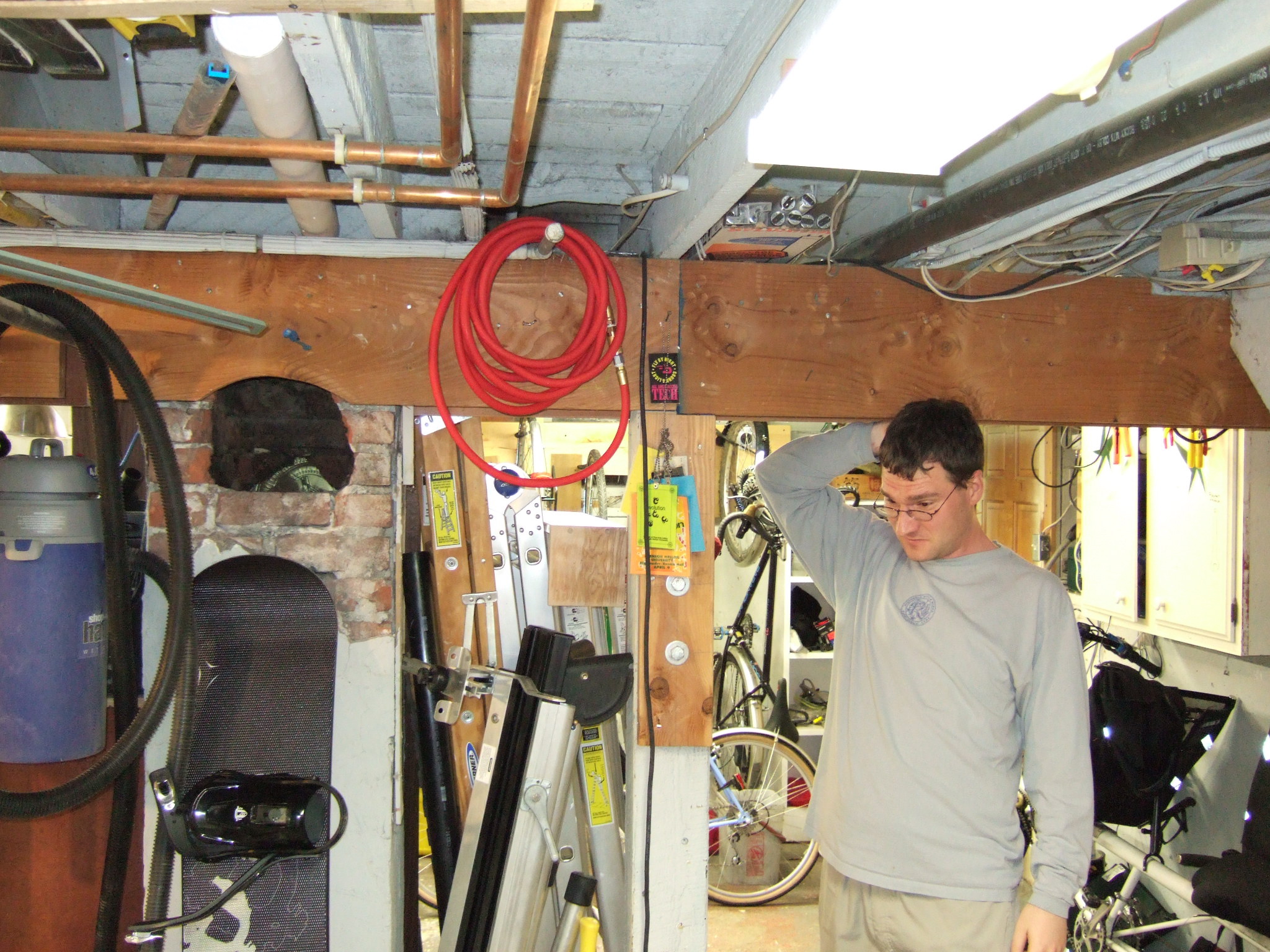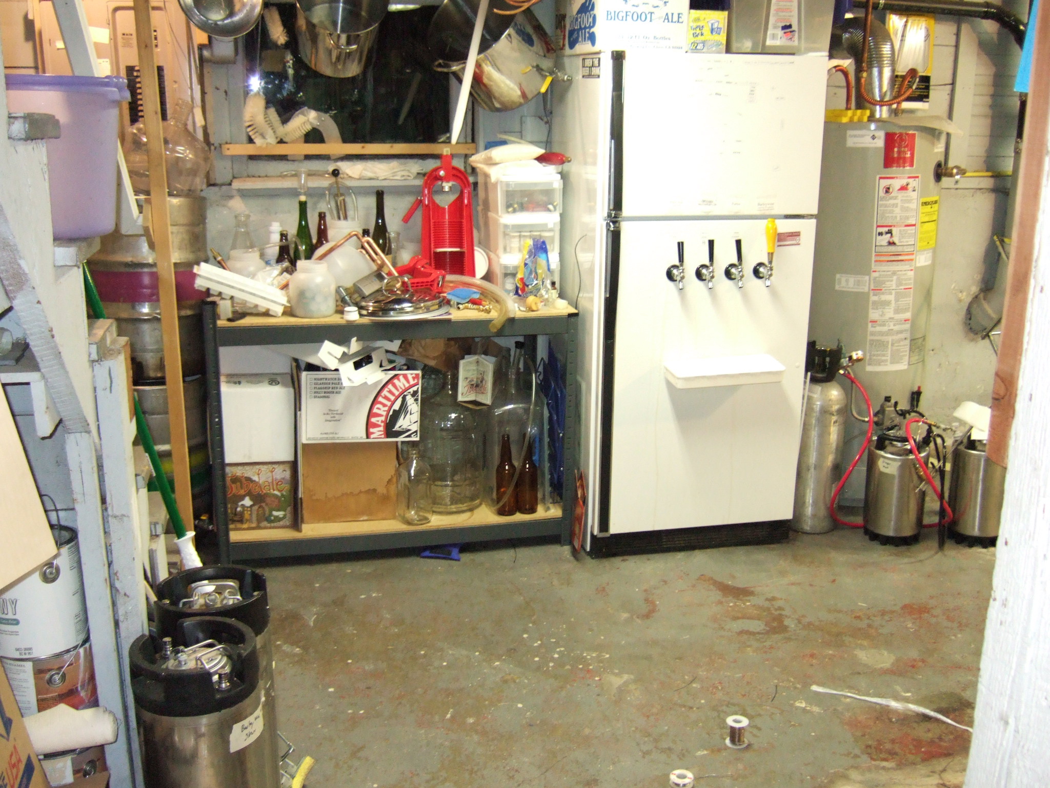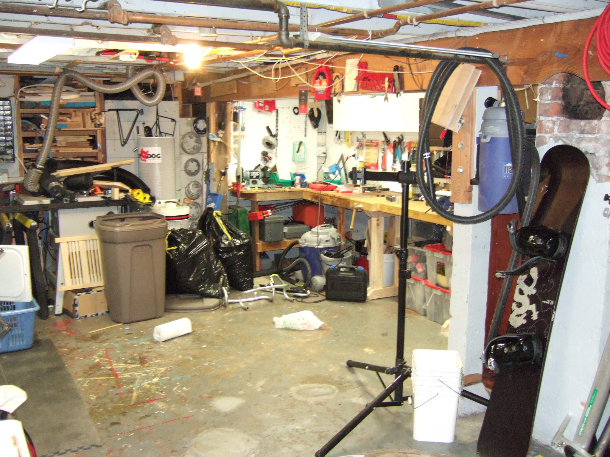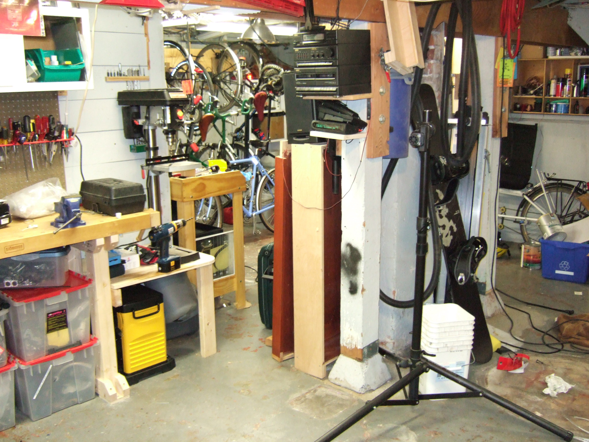 wall at one end. The cabinets and pegboard mostly don't have bike